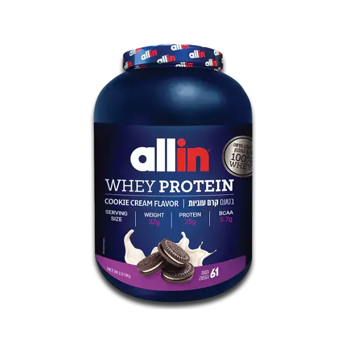אבקת החלבון של חברת Allin מכילה חלבון מי גבינה ואייזוליט ומגיע במגוון טעמים נבחרים .