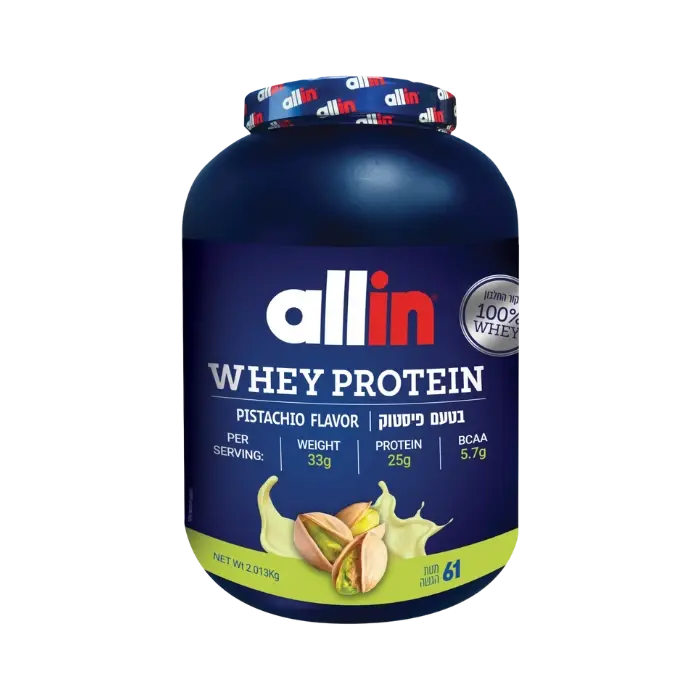 אבקות חלבון allin מגיעה באריזת חיסכון של 2 קילוגרם ומכילה 61 מנות הגשה. כל מנה מכילה כ 26 גרם חלבון ובנוסף כ 5.8 גרם BCAA!