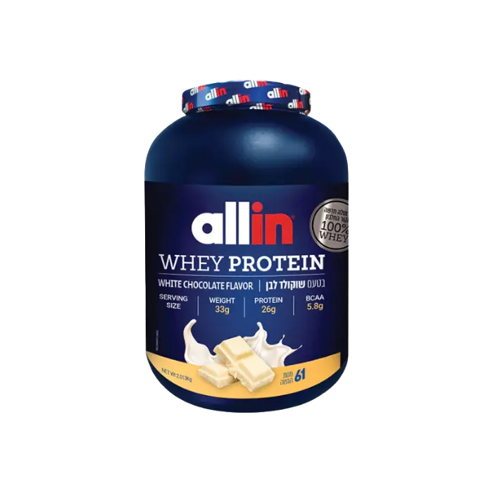 אבקות חלבון allin מגיעה באריזת חיסכון של 2 קילוגרם ומכילה 61 מנות הגשה. כל מנה מכילה כ 26 גרם חלבון ובנוסף כ 5.8 גרם BCAA!