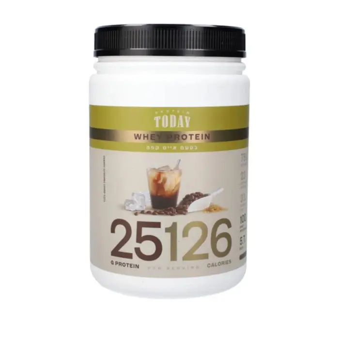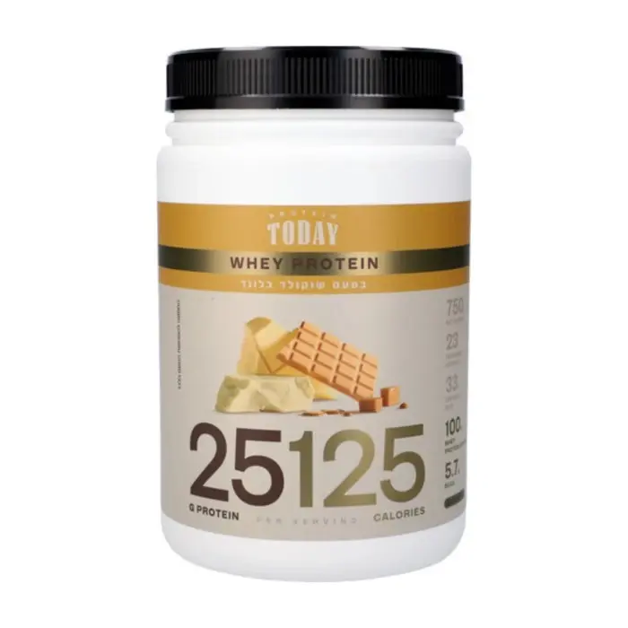 אבקת החלבון של חברת TODAY מכילה 25 גרם חלבון מי גבינה איכותי ורק 123-125 קלוריות.